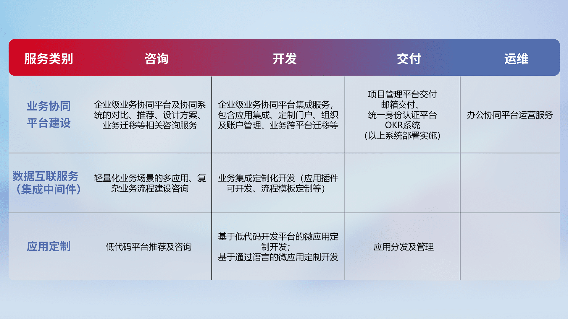 针对钉钉、、、、企微、、、IDaas等平台级产品提供产品的规划、、、、方案、、、交付、、、定制化开发等服务,,,,实现如统一协同办公、、、智能客户服务、、、混合会议管理、、智能数据查询、、、、等业务场景,,实现数字化转型。。。