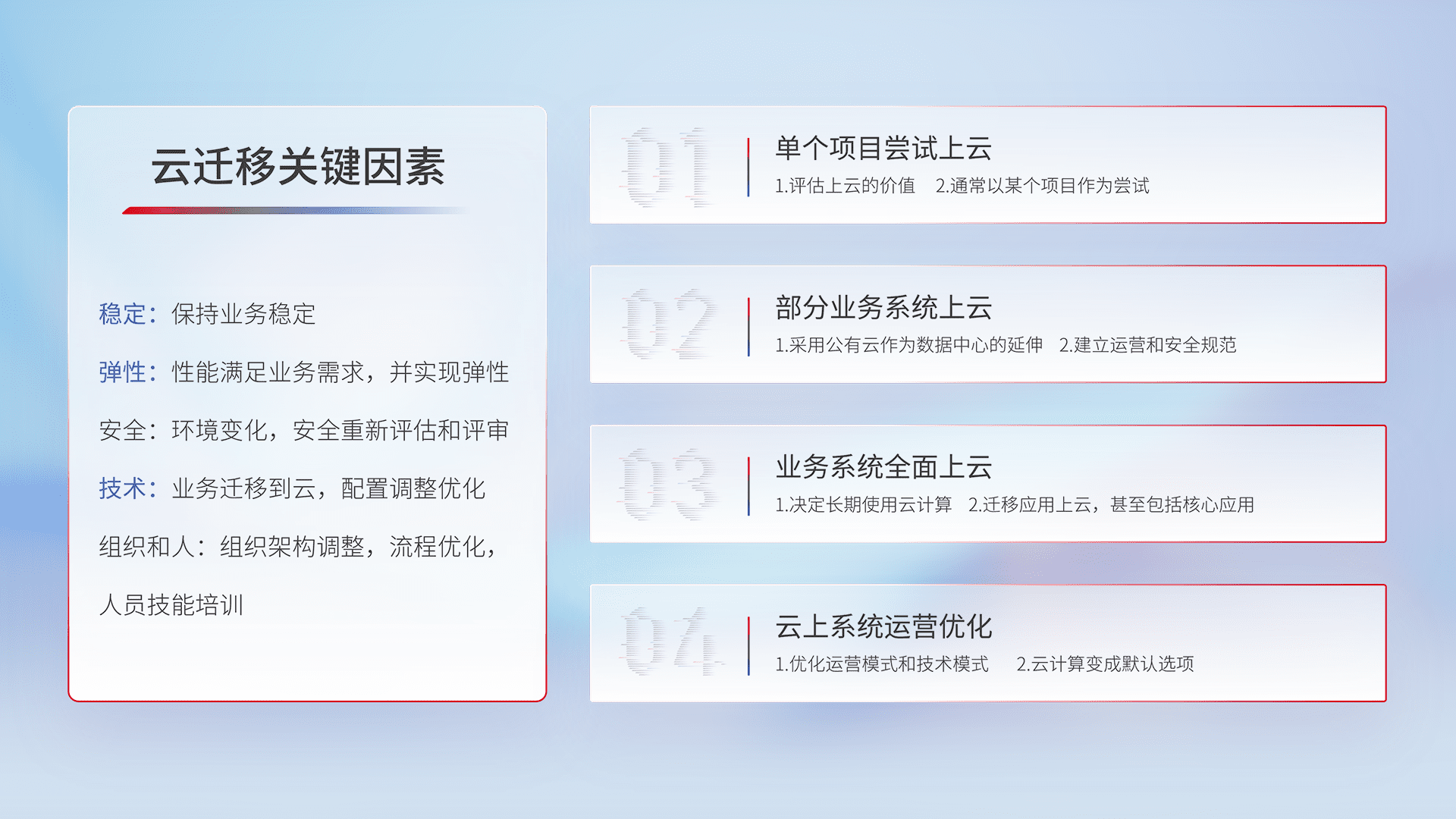 结合实际业务,,,,从规划设计、、、、云平台选型、、云原生改造、、数据迁移、、、、集成交付,,,,迁移全过程为客户识别最佳上云路径,,,,做好风险识别管理,,设计网络架构、、、身份权限、、安全审计合规、、、操作审计、、、日志审计、、、、监控告警策略、、多站点容灾设计等,,,,对云上基础设施进行整体规划,,,,提升IT治理水平,,,,以满足弹性、、、高可用、、、高性能的需求。。。