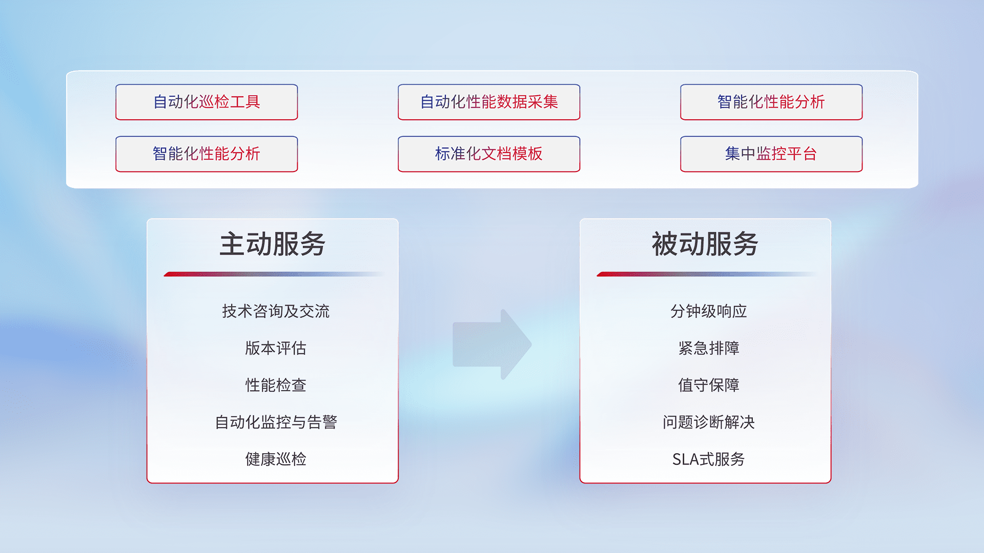 智能化工具和标准化文档,,保障服务质量,,提供主动服务(包含技术咨询、、、、版本评估、、、性能检查、、、自动化监控与告警、、、健康巡检)和被动服务包含(分钟级响应、、、紧急排障、、、、值守保障、、、、问题诊断解决、、、SLA服务)。。。。